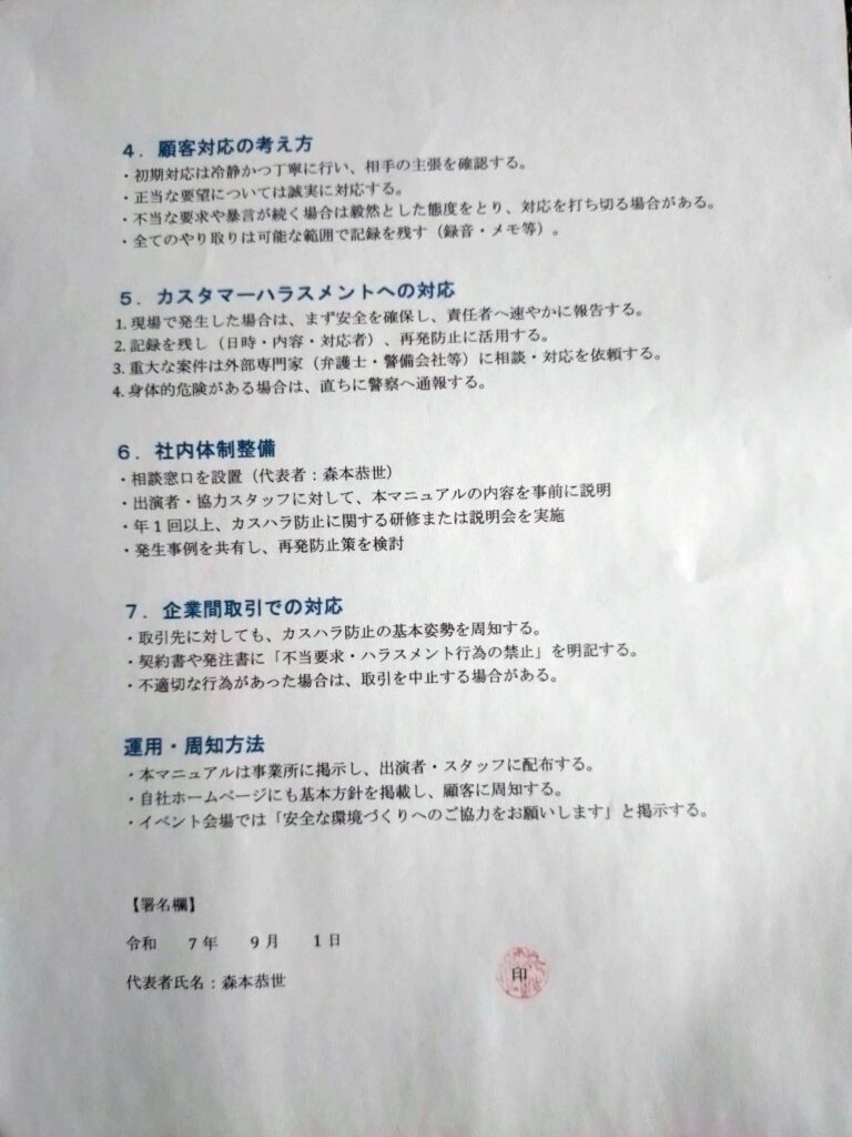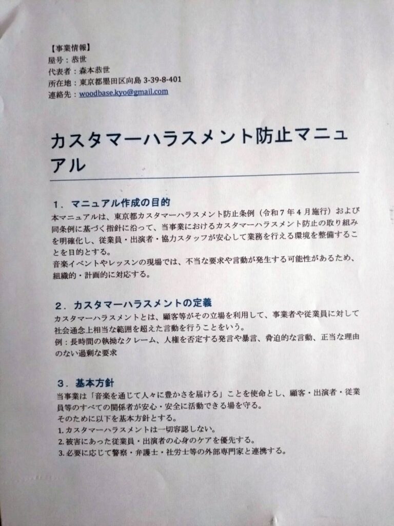 2025.09.2 お知らせ、未分類 カスタマーハラスメントに対する措置として 顧客等からのカスタマーハラスメントを防止するための措置として必要な体制の整理をおこない音楽イベントやレッスンの現場では、不当な要求や言動が発生する可能性があるため、組織的・計画的に対応するため手引きを作成しました。
